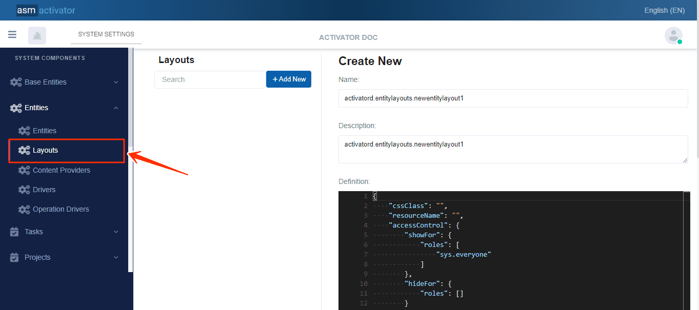 To create an entity Layout, you need to access the items listed under Entities and click on the highlighted item as illustrated in the image below👇: