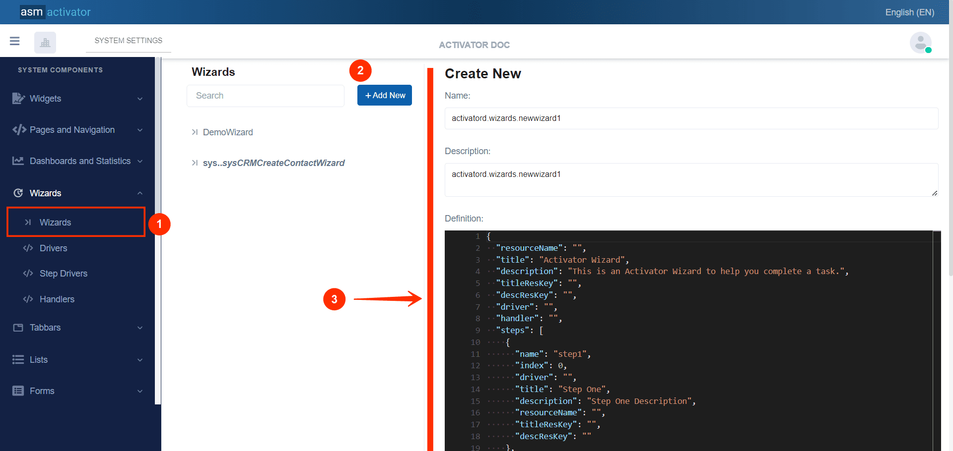 In Activator Admin , the Wizard component is located within the menu container, among the items listed under </>Wizards. As shown at (1) on the image below.