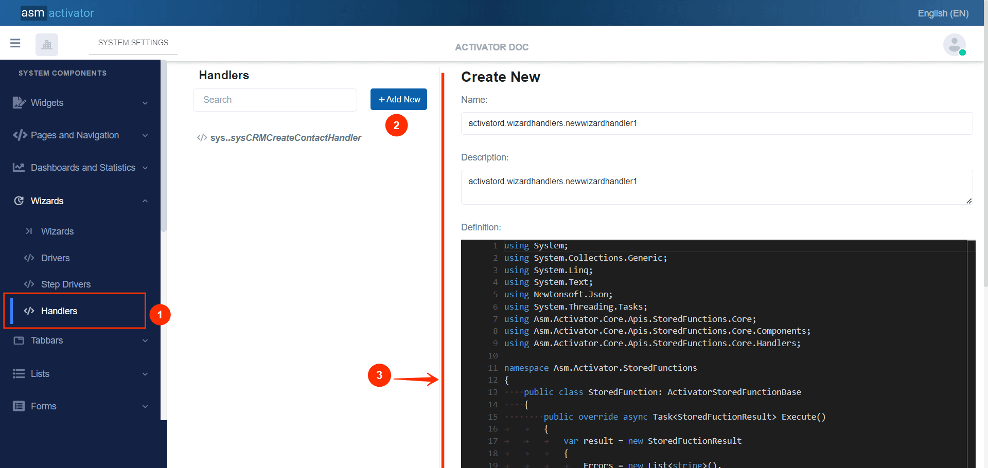 In Activator Admin , the Wizard Handler component is located within the menu container, among the items listed under </>Wizards. As shown at (1) on the image below.